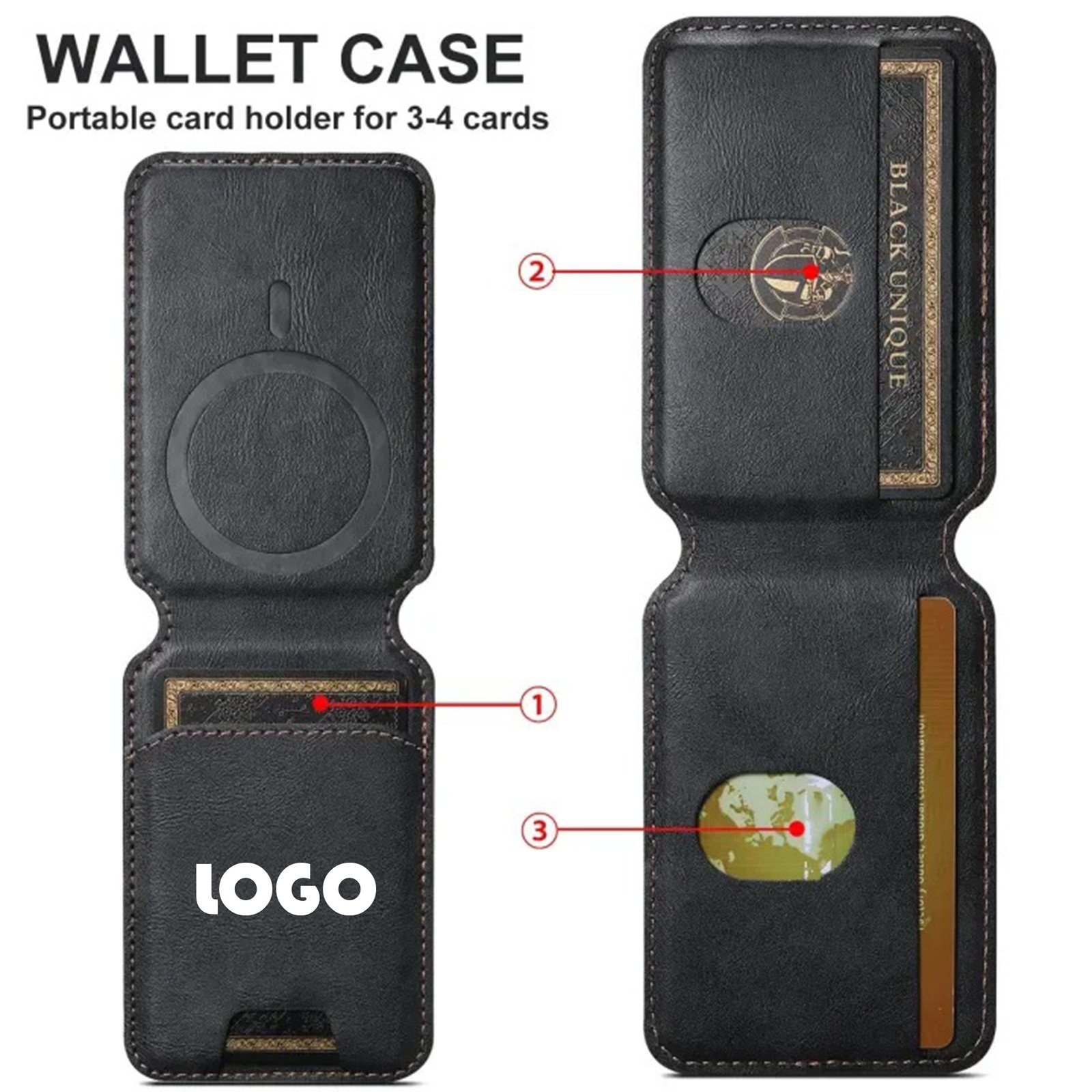 Elevate your business and streamline your daily commute with our PU Leather Magnetic Phone Card Wallet! Crafted from high-quality PU leather, this sleek and professional accessory is designed to make your life easier. The MagSafe-compatible magnet ensures a secure attachment to your phone, allowing you to carry 3-4 essential cards with ease. Not only does it keep your cards organized, but it also doubles as a convenient phone stand for hands-free use. Lightweight yet durable, this wallet is perfect for both corporate gifting and personal use. Add a touch of personalization by customizing it with your logo to promote your brand. With its seamless blend of style and functionality, this wallet is a must-have accessory for anyone on the go. Screen printing and debossing options are available for further customization. 4″ L x 2.65″ W